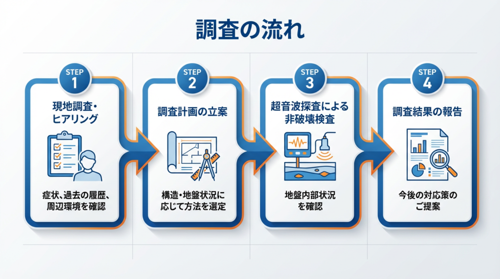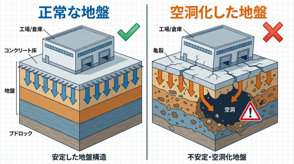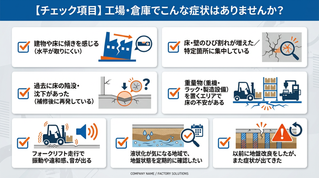 工場や倉庫、商業施設では、沈下が進むほど、設備・操業停止・安全配慮負担が大きくなるため、異変に気づいた段階で原因を把握することが重要です。