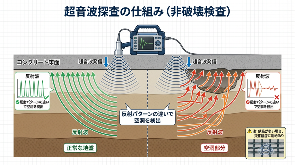 超音波探査は、コンクリート床を破壊せずに地盤の状態を把握できる非破壊検査です。一方で、コンクリート下に鉄筋が多い場合など、条件によっては超音波が鉄筋に反応し、奥の空洞まで正確に探査できないケースがあります。