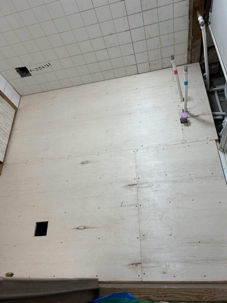 洗面室の床は下地からしっかりと作り替え、クッションフロアを施工するための土台まで丁寧に整えます。